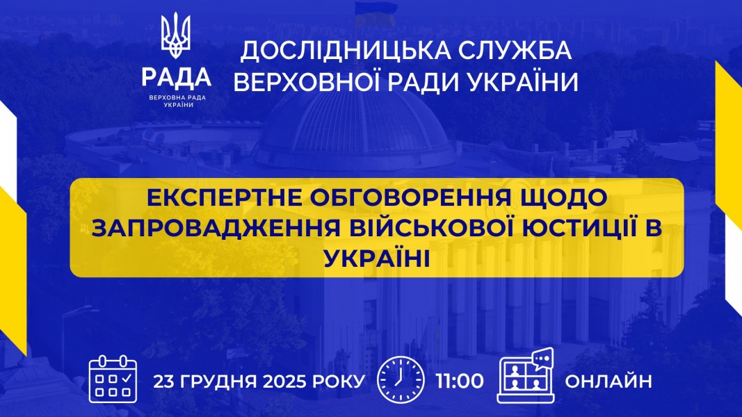 23 грудня 2025 року об 11.00 у Дослідницькій службі відбудеться експертне обговорення щодо запровадження військової юстиції в Україні. Запрошуємо зацікавлених осіб долучитися до обміну думками.