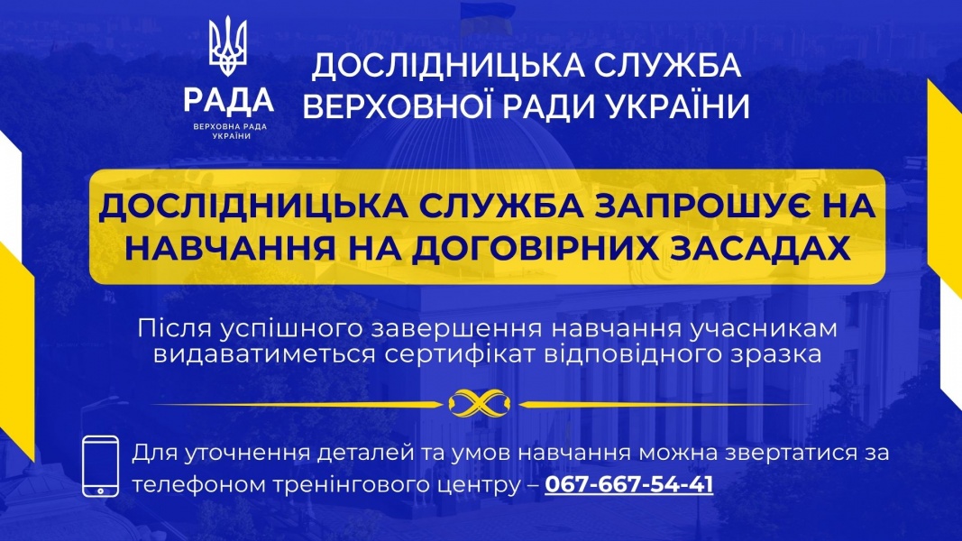 У лютому 2026 року Дослідницька служба Верховної Ради України проводить онлайн навчання (підвищення кваліфікації) для представників органів державної влади, органів місцевого самоврядування, інших юридичних і фізичних осіб на договірних засадах:
