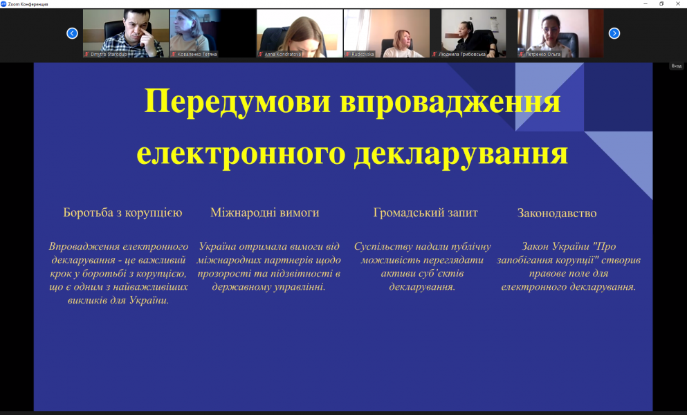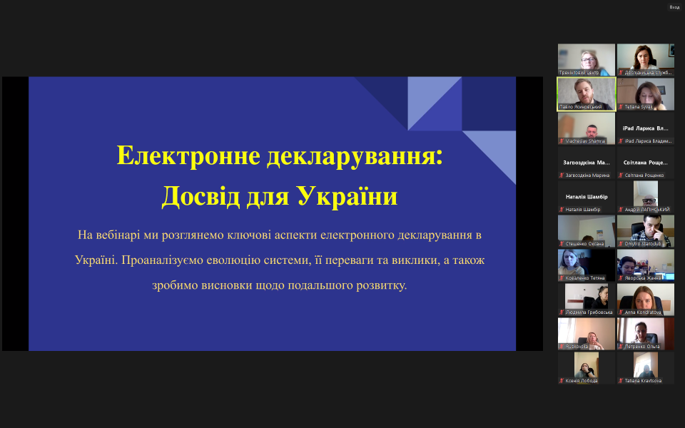 Актуальність вебінару обумовлена сучасними вимогами розвитку електронних систем декларування та підвищення прозорості в державному секторі. На вебінарі розглядалися ключові аспекти електронного декларування в Україні, проаналізовано еволюцію системи, її переваги та виклики, а також висновки щодо подальшого розвитку. Лектор наголосив, що впровадження електронного декларування сприяє посиленню боротьби з корупцією, удосконаленню процесів адміністрування податків, а також покращенню контролю за фінансовими потоками. В умовах цифровізації та глобалізації економіки електронне декларування допомагає забезпечити ефективне функціонування механізмів, що сприяють боротьбі з корупцією. Поширення знань і практичних навичок серед державних службовців щодо функціонування електронних систем декларування є необхідним для подальшого розвитку євроінтеграції в Україні.