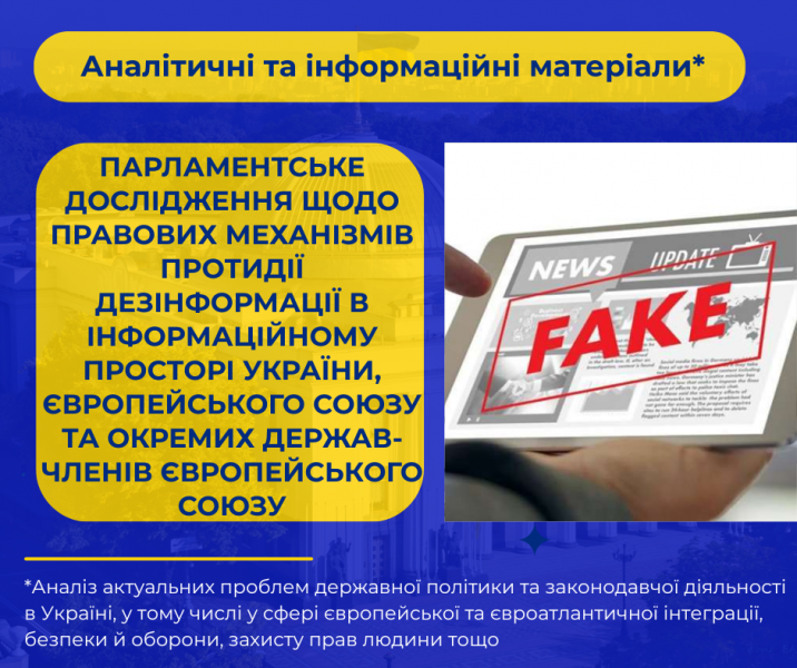 У парламентському дослідженні представлено результати аналізу особливостей правового регулювання протидії дезінформації в інформаційному просторі України, Європейського Союзу (ЄС) та деяких держав-членів ЄС. Акцентовано увагу на новелах законодавства щодо протидії дезінформації в ЄС, Литві, Німеччині та Франції.