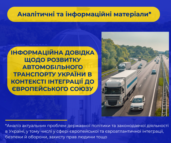 В інформаційній довідці узагальнено інформацію щодо розвитку автомобільного транспорту України в контексті європейської інтеграції. Проаналізовано основні нормативно-правові акти, що визначають стратегічні орієнтири модернізації автотранспортної галузі, також розглянуто основні напрями реформ, зокрема у сфері адаптації українського законодавства до законодавства Європейського Союзу, модернізації транспортної інфраструктури, запровадження екологічних стандартів та впровадження європейських вимог безпеки перевезень.