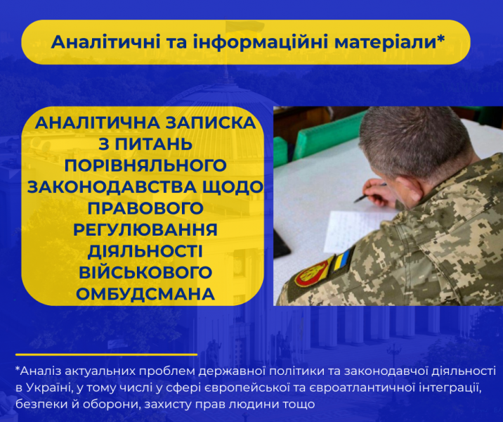 В аналітичній записці розглянуто правову регламентацію та особливості функціонування трьох моделей інституту військового омбудсмана в таких державах, як Бельгія, Ірландія, Нідерланди, Німеччина, Норвегія, Швеція. Також узагальнено дані щодо діяльності військових омбудсманів у 18 європейських державах.