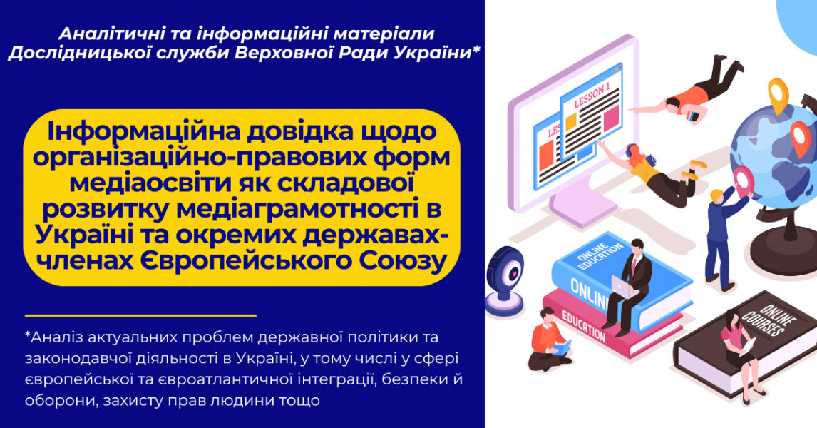 В інформаційній довідці викладено результати аналізу організаційно-правових форм медіаосвіти як складової розвитку медіаграмотності в Україні та окремих державах-членах ЄС: Данії, Естонії, Латвії, Фінляндії, Швеції. Акцентовано увагу на формах медіаосвіти, що пропонуються на рівні повної загальної середньої освіти, яка включає початкову, базову середню та профільну середню освіту.