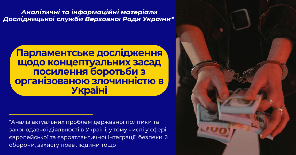 У парламентському дослідженні розглядаються концептуальні основи вдосконалення правового регулювання запобігання та протидії організованій злочинності в Україні з урахуванням сучасних суспільних тенденцій та викликів. Із цією метою проаналізовано стратегічні та інші програмні документи публічної політики, міжнародно-правові акти, у тому числі Європейського Союзу (далі – ЄС), що визначають інституційно-правові засади міжнародного співробітництва з питань протидії організованій злочинності, відповідні міжнародні та європейські правові стандарти. Особливу увагу приділено рекомендаціям Європейської Комісії, викладеним у Звітах щодо України в рамках Пакета розширення ЄС за 2022– 2024 роки, спрямованим на узгодження законодавства України з основними вимогами права ЄС (acquis) у сфері протидії організованій злочинності.