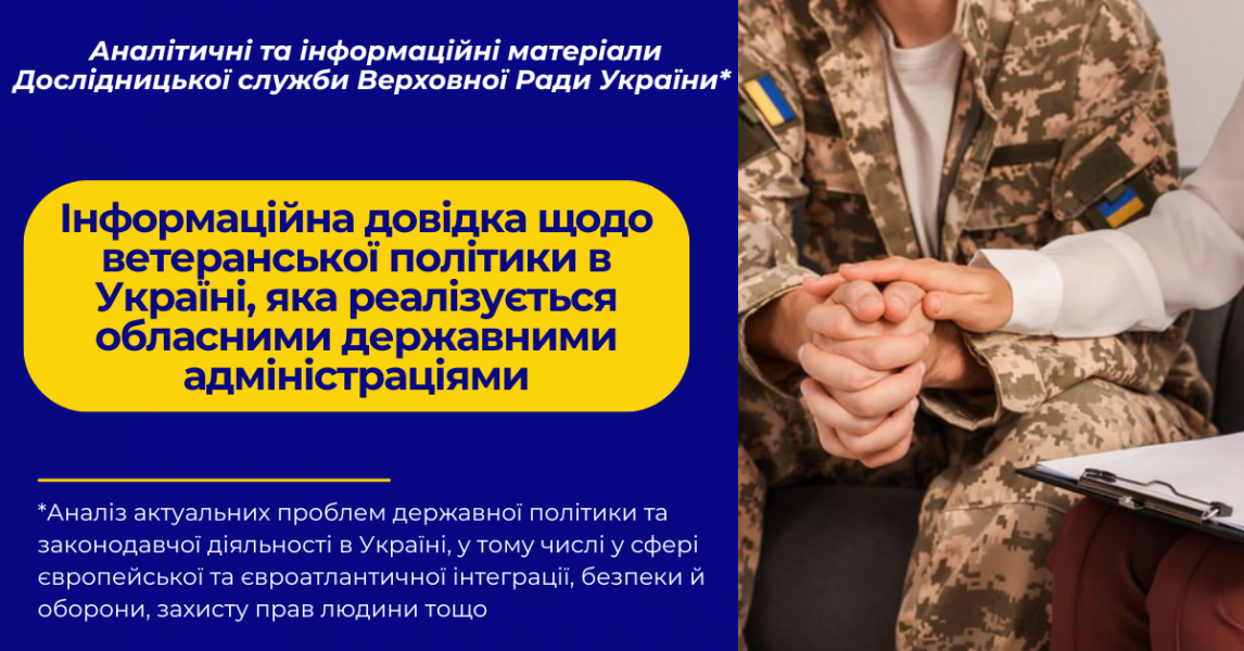 В інформаційній довідці викладено результати аналізу ветеранської політики в Україні, яка реалізується обласними державними адміністраціями. Виокремлено основні її напрями, наведено приклади реалізованих заходів, проєктів / програм.