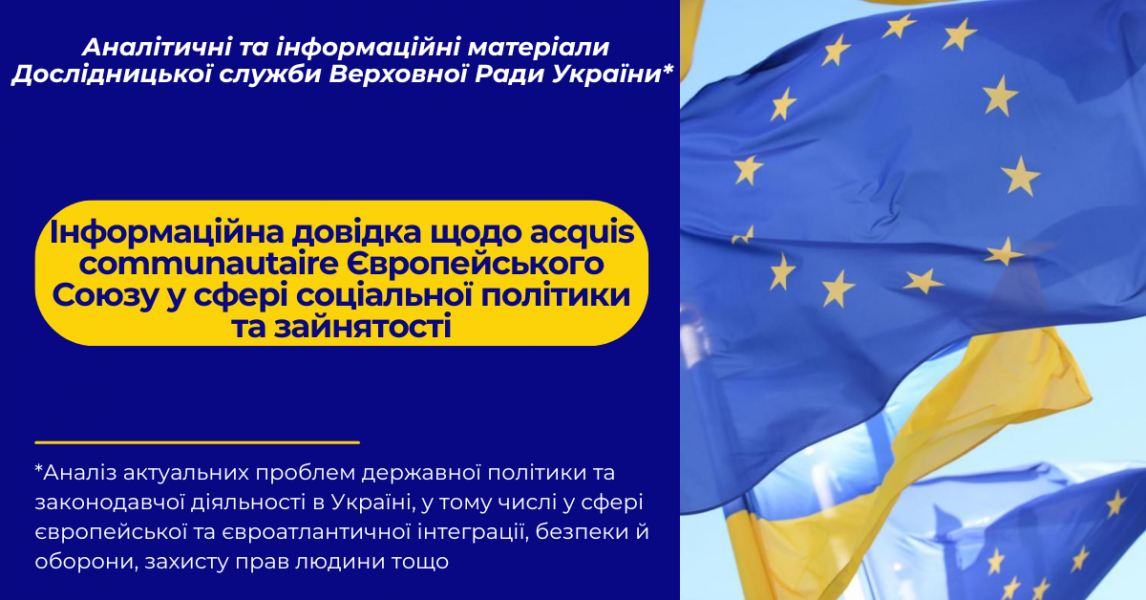 В інформаційній довідці узагальнено результати аналізу обов’язкового мінімуму законодавства Європейського Союзу (acquis communautaire) у сфері соціальної політики та зайнятості, порядку його імплементації в законодавство України. Акцентовано увагу на співвідношенні права Європейського Союзу та міжнародного права.