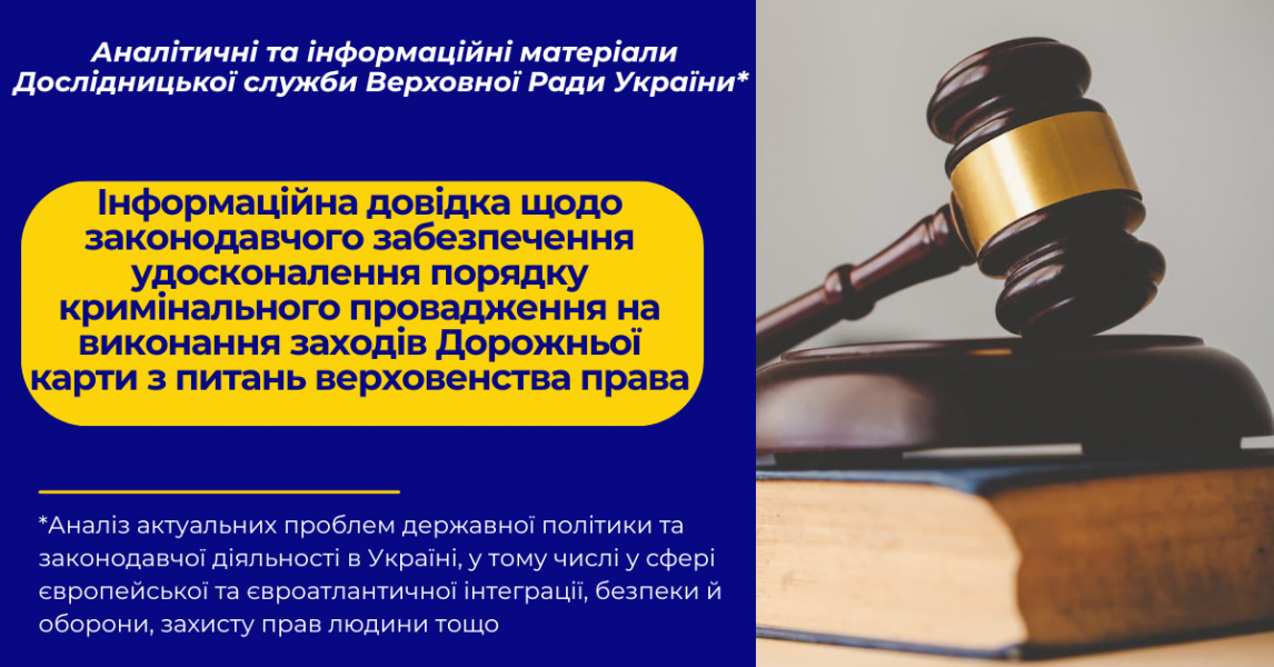 В інформаційній довідці узагальнено заходи, передбачені Дорожньою картою з питань верховенства права, які спрямовані на удосконалення кримінального провадження. Проаналізовано стан виконання цих заходів і окреслено перспективи удосконалення кримінального процесуального законодавства України.