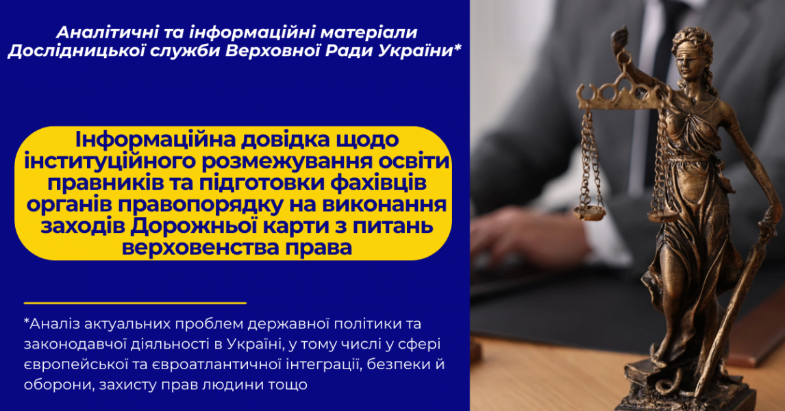 В інформаційній довідці узагальнено заходи Дорожньої карти з питань верховенства права, спрямовані на інституційне розмежування освіти правників та підготовки фахівців органів правопорядку відповідно до рекомендацій Європейської Комісії. Проаналізовано стан виконання цих заходів і окреслено проблемні питання у контексті вдосконалення законодавства України.