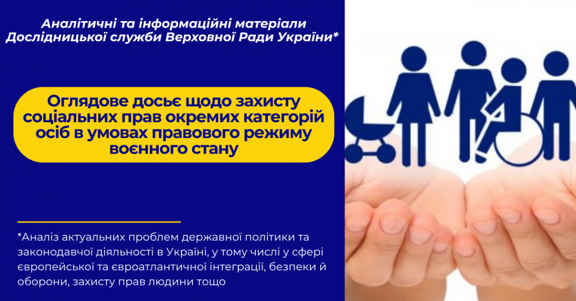 Оглядове досьє присвячено аналізу норм законодавства щодо гарантій соціальних прав ветеранів війни, військовослужбовців, цивільних осіб, які постраждали внаслідок війни та деяких інших уразливих категорій населення. Досліджено пріоритетні напрямки розвитку законодавства про соціальний захист в умовах правового режиму воєнного стану. Акцентовано увагу на відповідності правового регулювання заходів соціального захисту уразливих категорій населення міжнародним і європейським принципам.