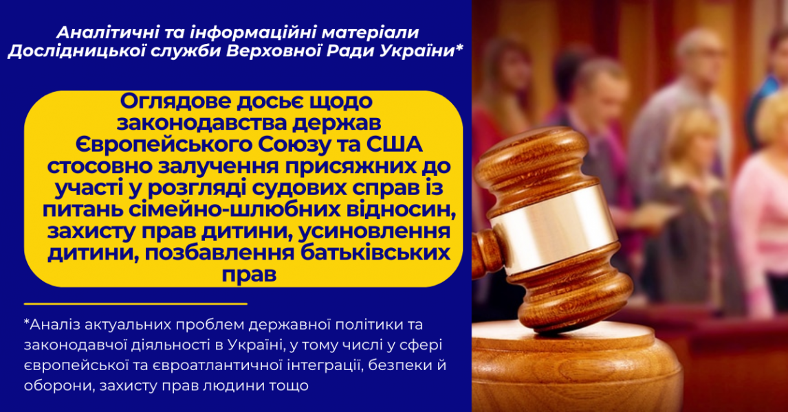 Оглядове досьє містить аналіз законодавства держав Європейського Союзу та США стосовно залучення присяжних до участі у розгляді судових справ із питань сімейно-шлюбних відносин, захисту прав дитини, усиновлення дітей і позбавлення батьківських прав; проаналізовано законодавче регулювання в окремих штатах США, судові прецеденти, а також регулювання у державах Європейського Союзу подібних до суду присяжних інститутів.