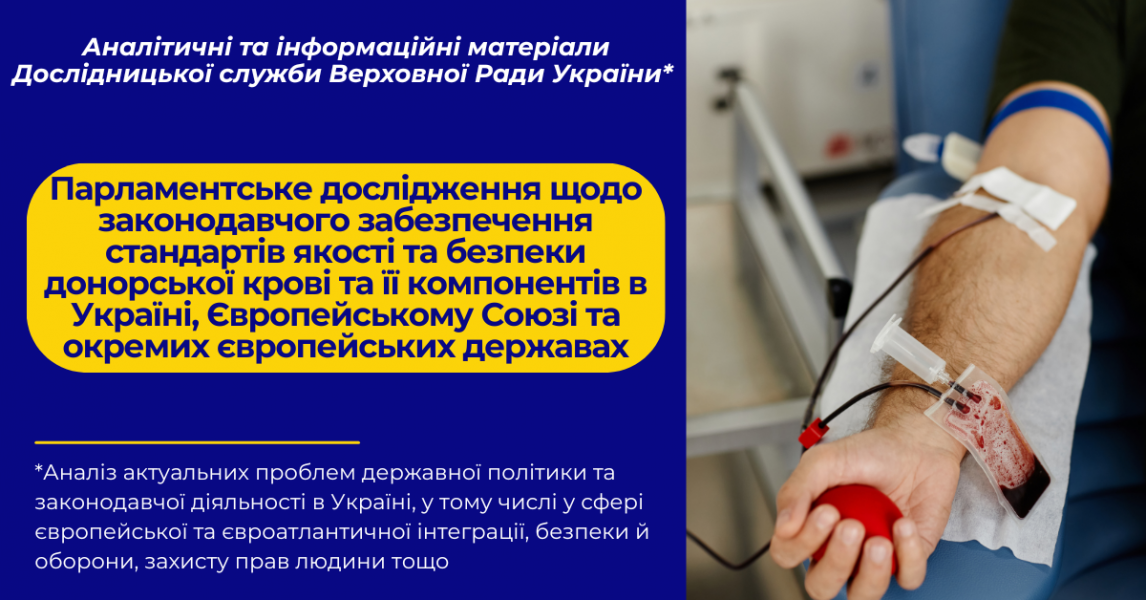 У парламентському дослідженні представлено результати аналізу законодавства України та Європейського Союзу щодо забезпечення якості й безпеки донорської крові та її компонентів. Акцентовано на основних положеннях Закону України «Про безпеку та якість донорської крові та компонентів крові» та Регламенту (ЄС) 2024/1938 Європейського Парламенту та Ради від 13 червня 2024 року про стандарти якості та безпеки речовин людського походження, призначених для застосування людиною. Проаналізовано стан і тенденції розвитку законодавства з питань якості й безпеки донорської крові та її компонентів в деяких європейських державах (Австрії, Польщі, Португалії, Чехії, Швейцарії.