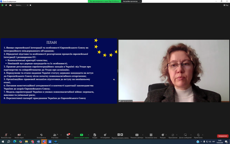 14 квітня 2026 року у Дослідницькій службі Верховної Ради України відбулося навчання за спеціальною короткостроковою програмою підвищення кваліфікації «Євроінтеграція в умовах війни: стан, проблеми, виклики» для народних депутатів України, працівників Апарату Верховної Ради України, помічників-консультантів народних депутатів України, а також представників органів державної влади, органів місцевого самоврядування та інших юридичних і фізичних осіб (на договірних засадах).