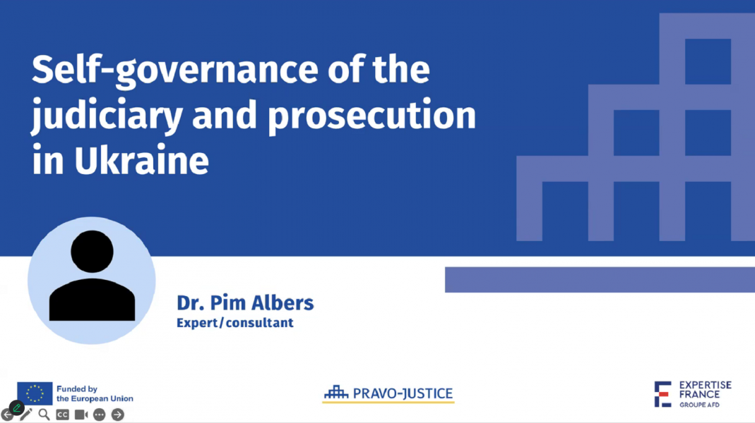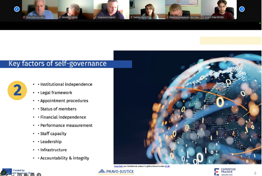 Під час вебінару було розглянуто ключові аспекти функціонування органів суддівського та прокурорського самоврядування, зокрема інституційну незалежність, механізми призначення та звільнення їх членів, рівень фінансової автономії, кадрову спроможність, ефективність діяльності, а також питання підзвітності, прозорості та доброчесності. Окрему увагу приділено порівняльному аналізу європейських стандартів і практик та їх застосуванню в Україні.